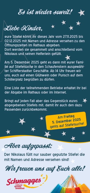 Ich sehe was, was du nicht siehst und das ist… dein Stiefel! Die erfolgreiche Nikolaus-Stiefel-Aktion vom Stadtmarketing und den Schifferstadter Einzelhändlern gemeinsam mit Schmagges e.V. geht dieses Jahr in die nächste Runde.