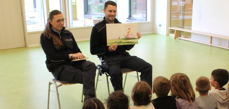 Zum bundesweiten Vorlesetag am Freitag, 21. November hatte die Kindertagesstätte Entdeckungskiste Besuch von zwei Polizeibeamten der Polizeiinspektion Kaiserslautern. Die beiden sowie die ehrenamtliche Vorleserin Frau Himmel nahmen sich viel Zeit und lasen den Kindern mehrere Bilderbücher vor.